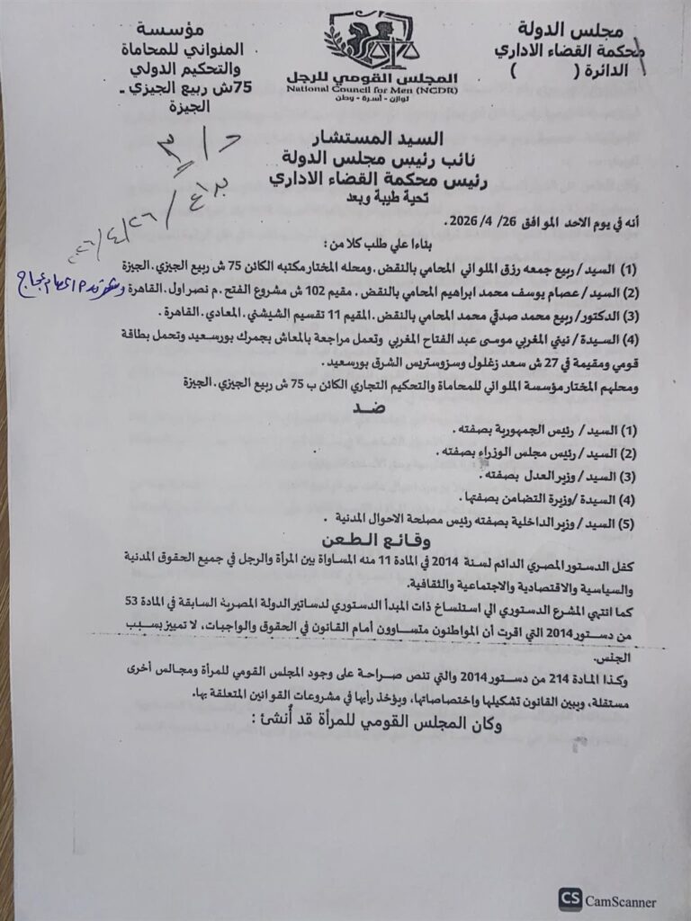 دعوى قضائية للمطالبة بإنشاء “المجلس القومي للرجل” لتحقيق المساواة في الحقوق