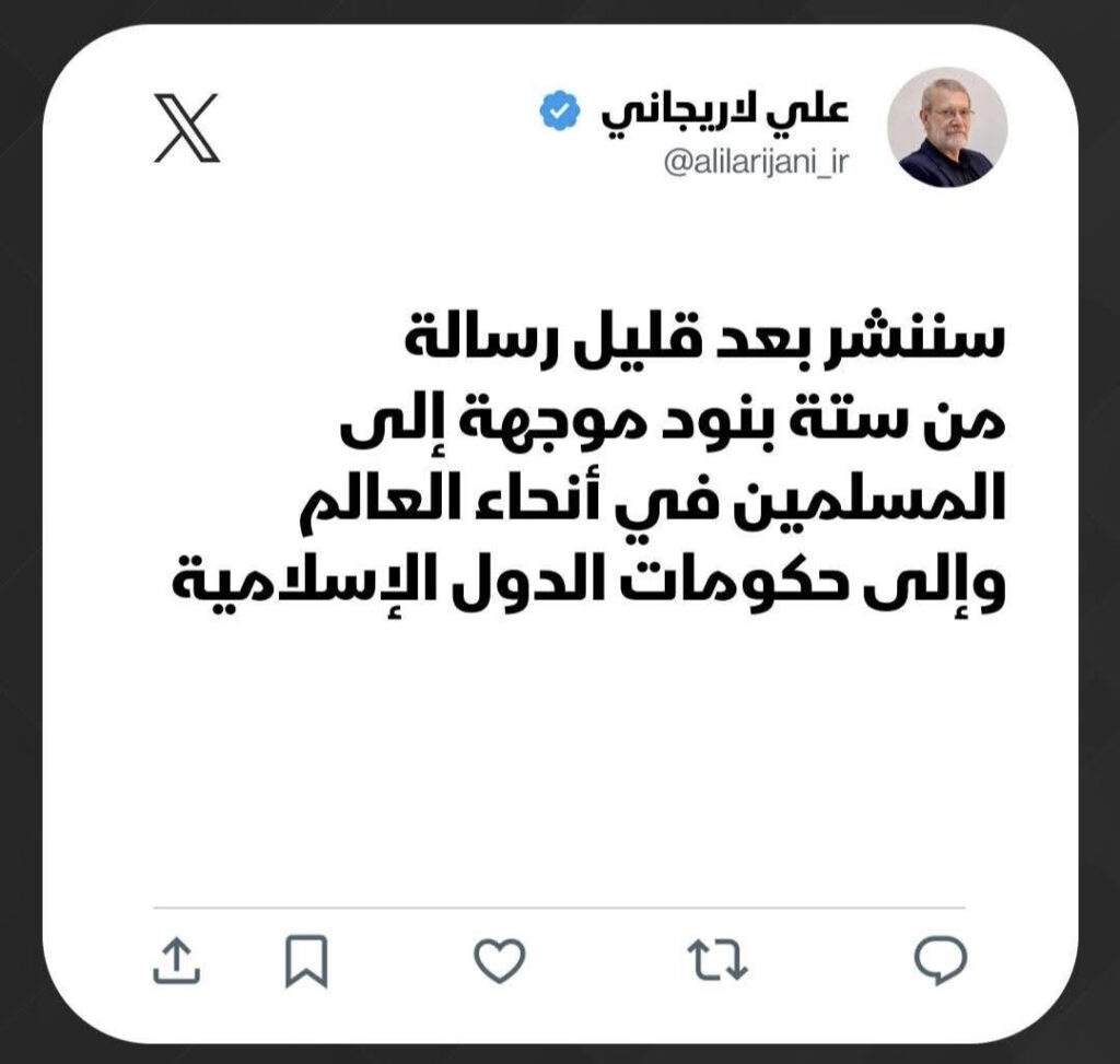 أعلن أمين المجلس الأعلى للأمن القومي الإيراني علي لاريجاني أنه سيكشف قريباً عن رسالة تتضمن ستة بنود موجهة إلى المسلمين في مختلف أنحاء العالم وإلى حكومات الدول الإسلامية.