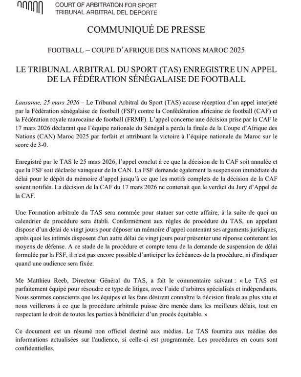أعلنت محكمة التحكيم الرياضي، اليوم الأربعاء 25 مارس 2026، توصلها رسميًا بطعن مقدم من الاتحاد السنغالي لكرة القدم ضد كل من الاتحاد الإفريقي لكرة القدم والجامعة الملكية المغربية لكرة القدم، على خلفية قرار نهائي كأس أمم إفريقيا 2025.