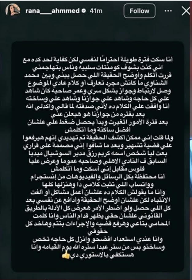 وقالت رنا أحمد، في منشور عبر حسابها على مواقع التواصل الاجتماعي، إنها التزمت الصمت لفترة طويلة احترامًا لنفسها، رغم ما كانت تتعرض له من تعليقات سلبية، لكنها قررت أخيرًا الحديث وتوضيح ما حدث.