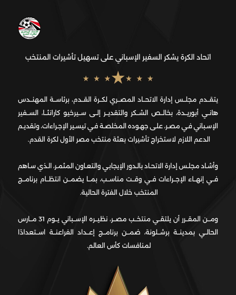 تقدم مجلس إدارة الاتحاد المصري لكرة القدم، برئاسة المهندس هاني أبو ريدة، بخالص الشكر والتقدير إلى السفير الإسباني في مصر، سيرخيو كارناثا، تقديرًا لجهوده في تسهيل إجراءات استخراج تأشيرات بعثة منتخب مصر الأول.