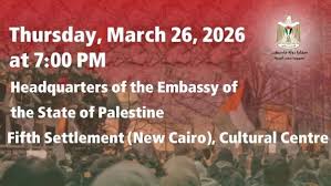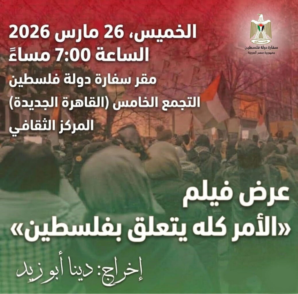 تنظم سفارة دولة فلسطين بالقاهرة يوم الخميس 26 مارس 2026 عرضًا خاصًا للفيلم الوثائقي “الأمر كله يتعلق بفلسطين” وذلك على الساعة 7 مساء بمقر سفارة دولة فلسطين، بحضور المنتجة والمخرجة دينا أبو زيد .