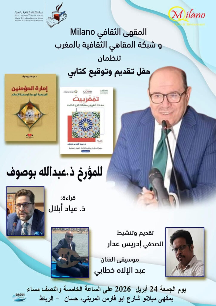 تحتضن مدينة الرباط، يوم الجمعة 24 أبريل 2026 ابتداءً من الساعة الخامسة والنصف مساءً، لقاءً ثقافيًا خاصًا يحتفي بالمؤرخ والباحث الدكتور عبد الله بوصوف، وذلك ضمن حفل تقديم وتوقيع أحدث مؤلفاته بالمقهى الثقافي ميلانو بحي حسان.