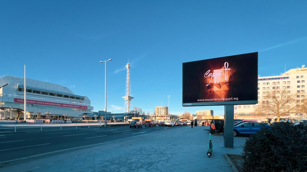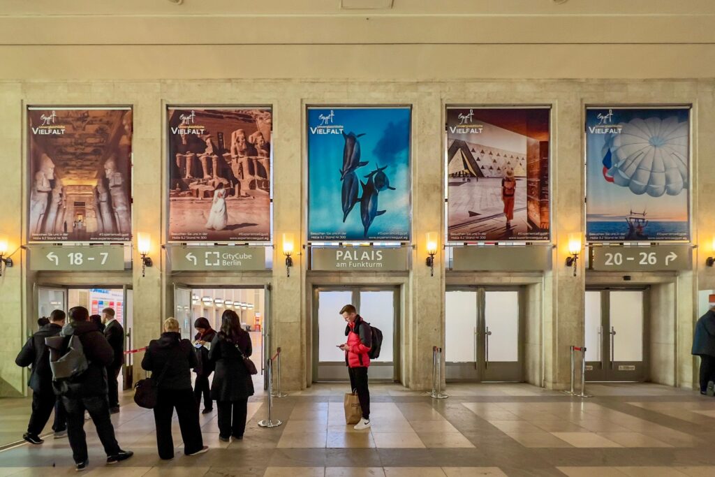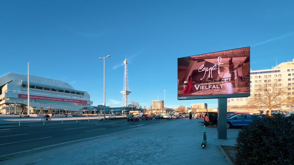 وأوضح محمد فرج مدير مكتب برلين أن الإعلانات الترويجية الموجودة بأرض المعارض تم وضعها بمواقع متميزة بما يتيح لزائري البورصة رؤيتها مما يساهم في خلق الشغف لديهم وجذبهم لزيارة الجناح المصري والتعرف على ما يقدمه من منتجات سياحية؛ حيث تم وضع إعلانات خارجية عند المدخل الشمالي والمدخل الجنوبي للبورصة والمداخل الرئيسية لأرض المعارض، بالإضافة إلى إعلان على ” كوبري ميسي برلين الخاص ببورصة برلين” في ملتقي طرق ومداخل البورصة.