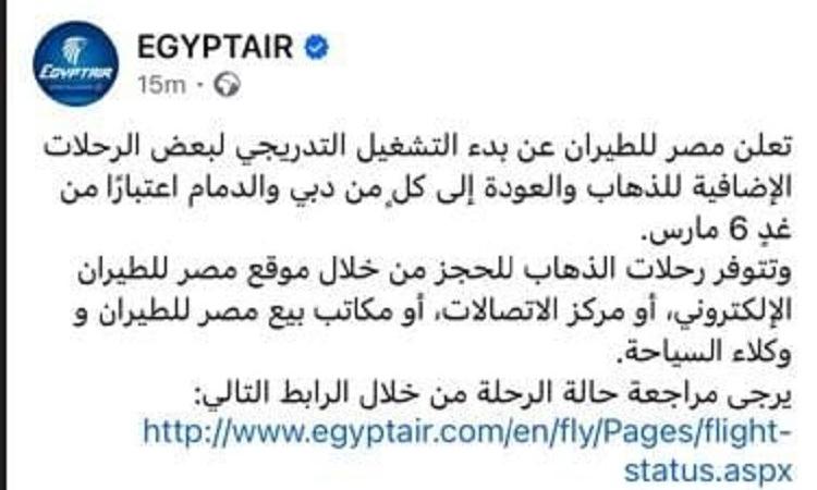 أعلنت الشركة الوطنية مصر للطيران عبر حسابها الرسمى علي موقع التواصل الإجتماعى فيس بوك عن بدء التشغيل التدريجي لبعض الرحلات الإضافية للذهاب والعودة إلى كلٍ من دبي والدمام اعتبارًا من اليوم 6 مارس.