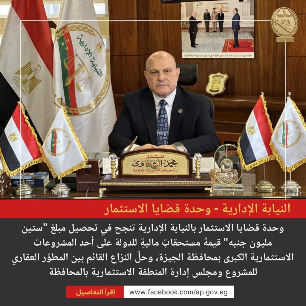 أعلنت هيئة النيابة الإدارية إنه تنفيذًا لتوجيهات المستشار/ محمد الشناوي – رئيس هيئة النيابة الإدارية، نجحت وحدة قضايا الاستثمار برئاسة المستشارة/ غادة يونس – نائب رئيس الهيئة ومديرة الوحدة، في تحصيل مبلغ “ستين مليون جنيه” قيمةَ مستحقاتٍ ماليةٍ للدولة على أحد المشروعات الاستثمارية الكبرى بمحافظة الجيزة، وحلِّ النزاع القائم بين المطوِّر العقاري للمشروع ومجلس إدارة المنطقة الاستثمارية بالمحافظة.