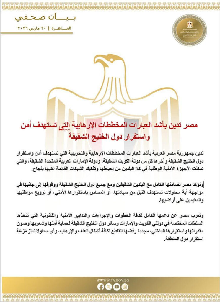 كما أعربت مصر عن دعمها الكامل للإجراءات والتدابير الأمنية والقانونية التي تتخذها السلطات المختصة في الكويت والإمارات، لحماية أمنهما وصون استقرارهما الداخلي، مؤكدة أهمية الحفاظ على استقرار المنطقة والتصدي لأي تهديدات تستهدف أمن شعوبها.