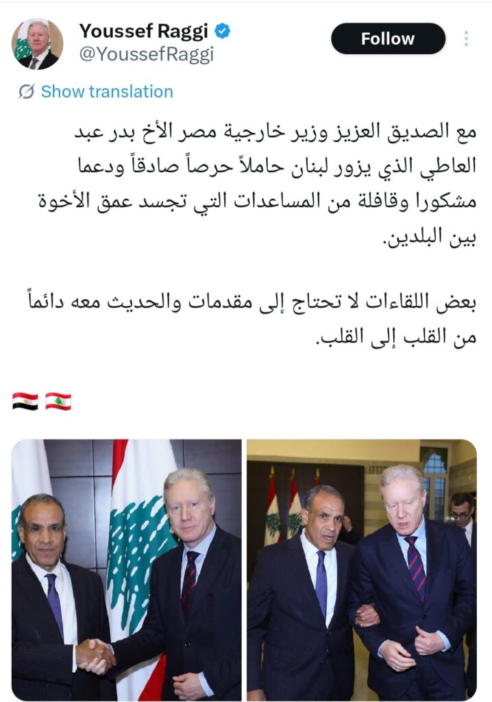 وكتب وزير الخارجية اللبناني – في تدوينة عبر منصة (إكس) – “مع الصديق وزير خارجية مصر بدر عبد العاطي الذي يزور لبنان حاملا حرصا صادقا ودعما مشكورا وقافلة من المساعدات التي تجسد عمق الأخوة بين البلدين.. بعض اللقاءات لا تحتاج إلى مقدمات و الحديث معه دائما من القلب إلى القلب”.