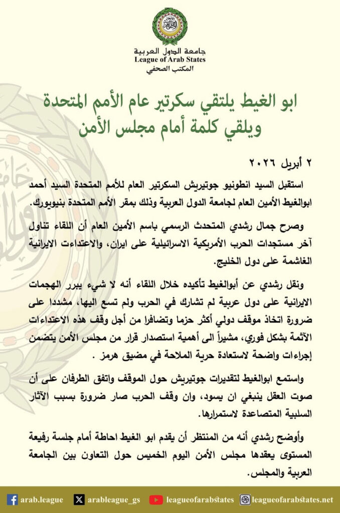 وشدد أبو الغيط على أن وقف الحرب الأميركية الإسرائيلية على إيران بات ضرورة ملحة، في ظل تصاعد آثارها السلبية على أمن واستقرار المنطقة.