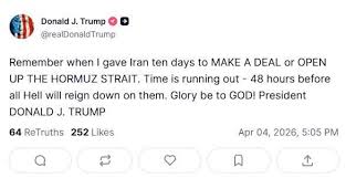 وفي بيان نشره على حسابه الرسمي على تروث سوشيال، قال ترامب :” تتذكرون عندما منحت إيران عشرة أيام للتوصل إلى اتفاق أو فتح مضيق هرمز؟ الوقت ينفد – 48 ساعة قبل أن تنزل عليهم عاصفة هوجاء. “